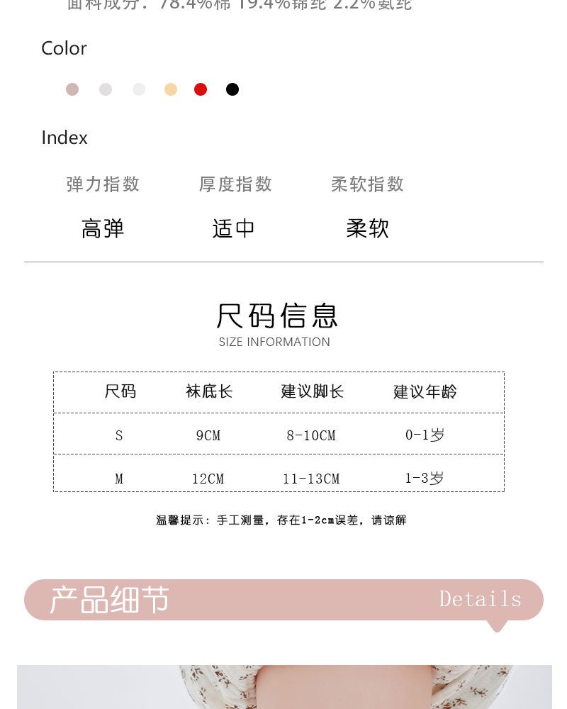 | Children's socks size | S size/0-1 years old/recommended foot length 8-10CM, M size/1-3 years old/foot length 11-13cm |