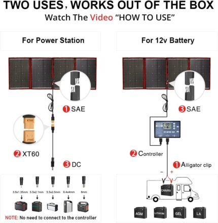 🏕️ Perfect for Outdoor Adventures and Emergencies: With a generous 9.85ft (3m) cable length from the panel to the controller, our solar panel is compatible with most power stations (such as Jackery, Goal Zero, Ecoflow, Paxcess) and 12-volt batteries (including AGM, LiFePo4, and deep cycle batteries). Whether you’re camping, traveling, or facing power outages, our solar panel is your dependable source of energy.