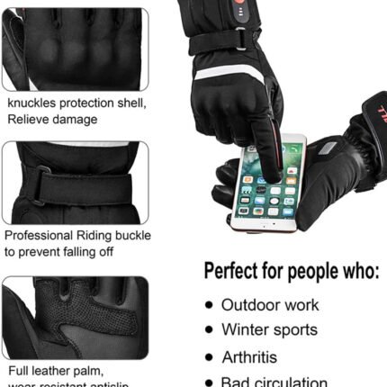 Professional Motorcycle Gloves: These heated gloves are designed for motorcycle enthusiasts, featuring sheep leather palms, durable polyester exteriors, windproof and waterproof materials, and a protective hard shell on the back of the hand for shock absorption.